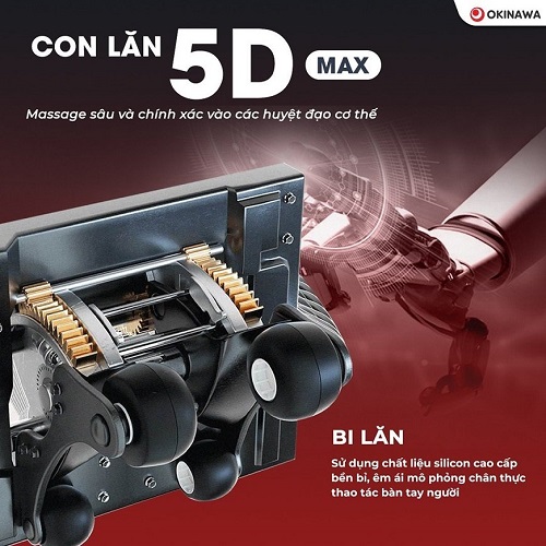 Okinawa OS-836 ứng dụng công nghệ massage 5D hiện đại với con lăn kép thao tác chuyên nghiệp như bàn tay người, massage áp lực khí chuyên sâu, giúp cơ thể người dùng được thư giãn hoàn toàn. Hệ thống con lăn Silicon cao cấp di chuyển linh hoạt cho phép vùng massage được mở rộng hơn và tác động sâu hơn tới những điểm đau nhức.